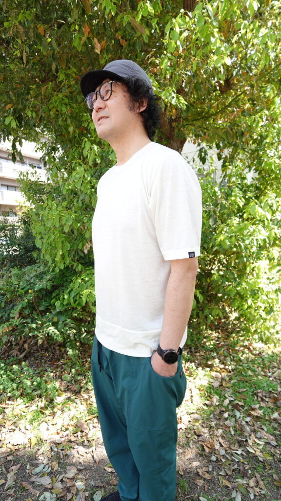 生地の厚みは143g/m²。 ウールのベースレイヤーは150g/m²前後が一般的ですが、 あえてやや薄めに設定しました。 透け感が出ない厚みは確保しつつ、 ポリエステル混紡による速乾性と耐久性で、年間を通して使える一枚に。